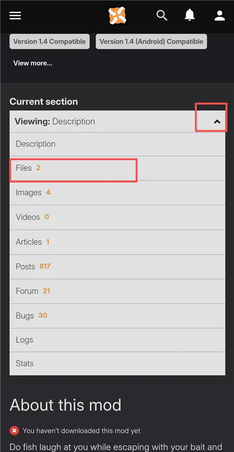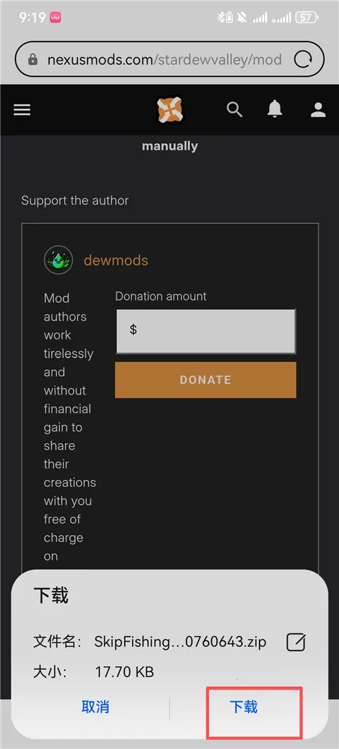 11、找到下载mod的地方,点击Skip fishing文件。