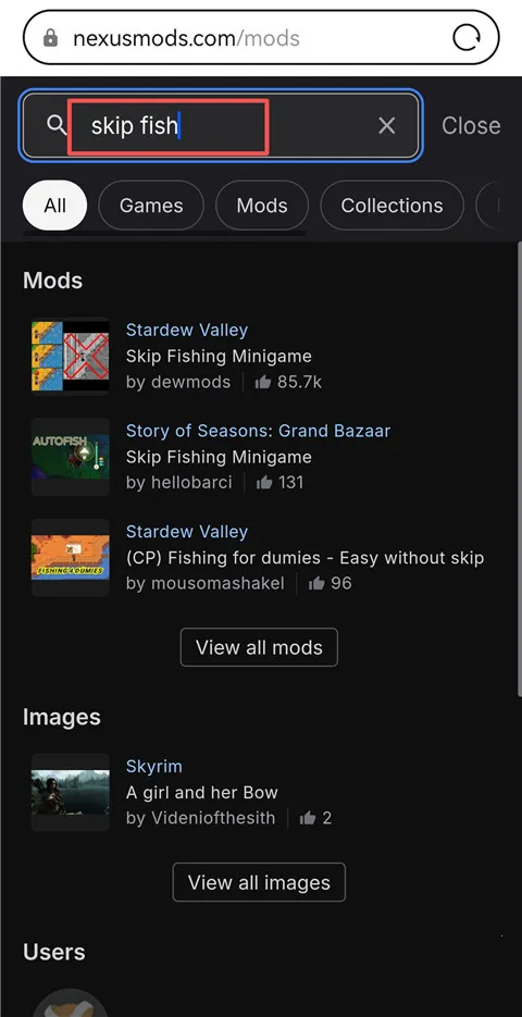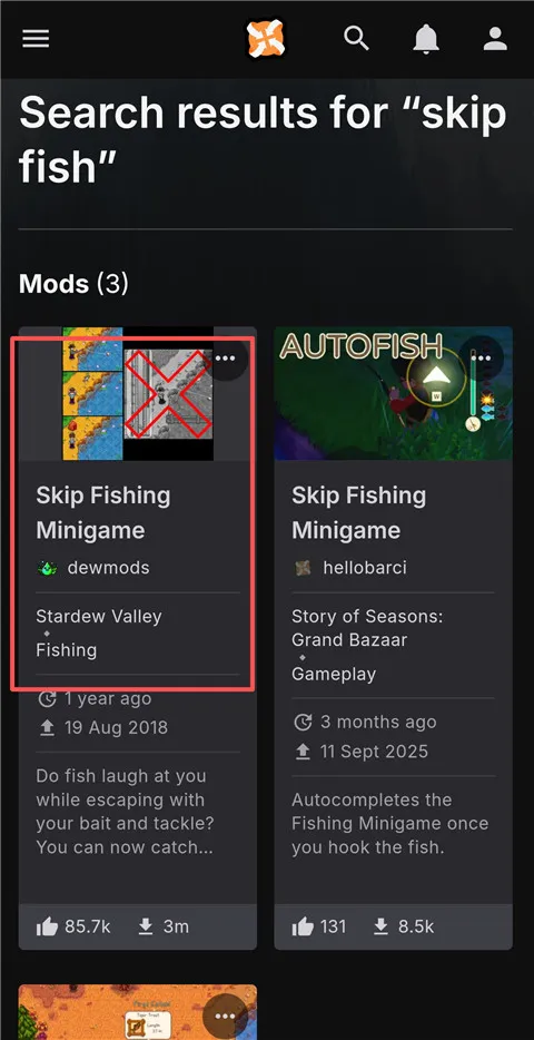 2、然后再搜索栏中搜索自己想要的mod下载,以钓鱼mod为例,搜索skip fish。