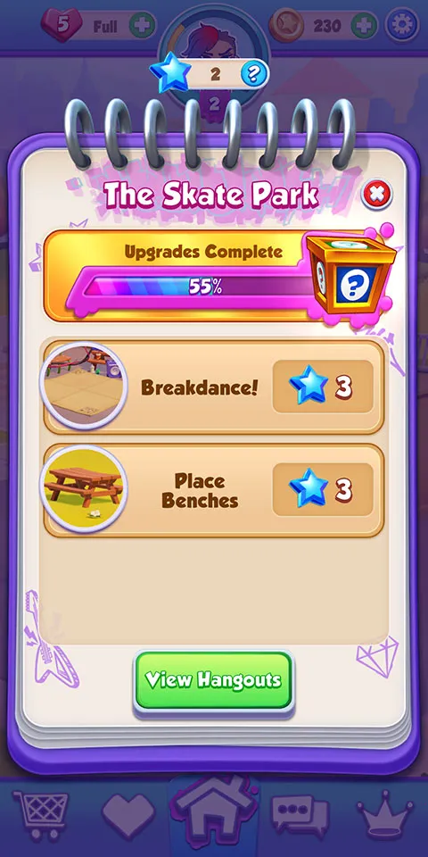 可探索并建造装饰滑板天堂,通过消除格子、破解谜题、完成关卡来解锁独特物品装饰聚会场所。