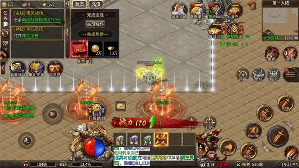 1. 百人同屏激战:可与众多兄弟一同在复古画风的游戏世界里,尽情体验攻占沙城的热血与激情,重温往昔经典传奇时光。
