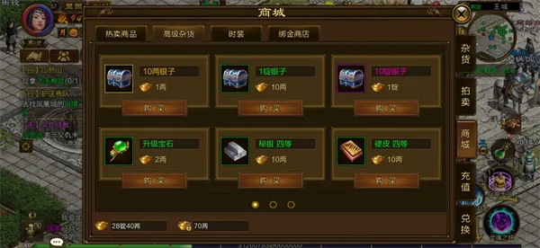 商城有出售升级宝石、硬皮、秘银,只要花费金子就能购买,也可在绑金商店使用绑定金子购买秘银、硬皮。每周商城还会退出限购礼包,可根据自己的策略购买礼包哦!
