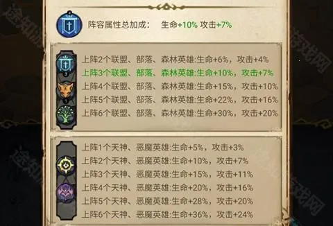 4、玩家通过上阵阵营英雄可以激活羁绊关系,获得额外属性加成。