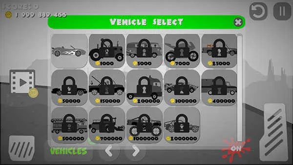 3、点击下方绿色的VEHICLES按钮,还可以更换汽车皮肤,这些皮肤需要消耗金币解锁。